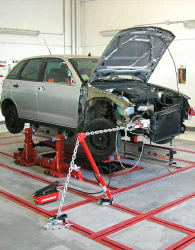 Nuestra bancada de estiramiento restaura la estructura de su vehículo con precisión, asegurando alineación perfecta y reparaciones estructurales de alta calidad.